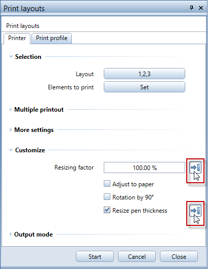 When printing multiple layouts, you can apply the Resizing factor and the Resize pen thickness option to all selected layouts with a single click.