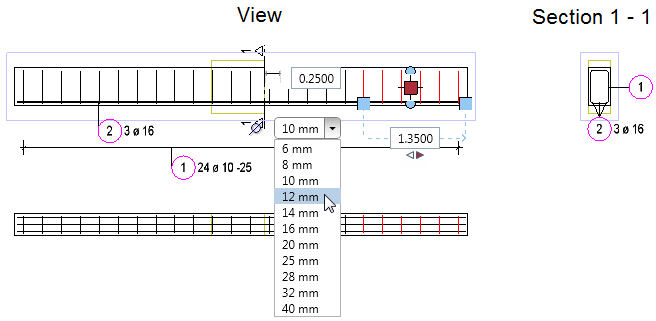 Allplan 2016 offers more options for modifying linear placements using handles. You can now change the diameter by selecting an entry in the list box.